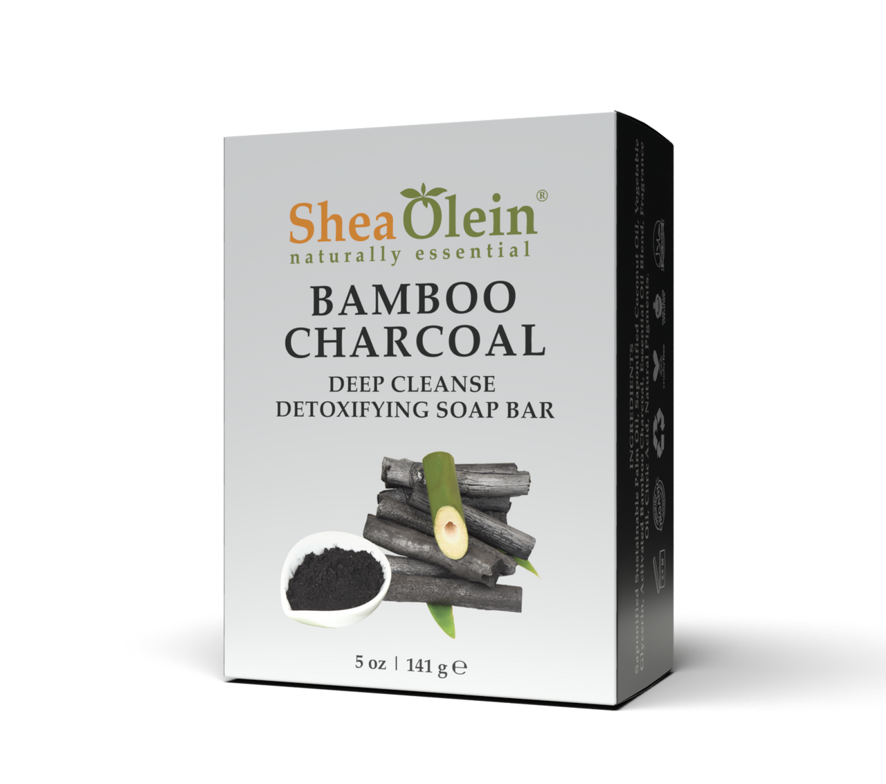 Through its powerful absorption properties, Shea Olein's certified organic Activated Bamboo Charcoal Detoxifying bar soap with Shea Butter extracts impurities and toxins from deep within your pores. Especially effective for oily skin, the active charcoal draws bacteria, chemicals, dirt, oil, and other micro-particles to the surface of the skin and are washed away. Its deep cleansing properties naturally exfoliate and brighten the skin to create a smoother, healthier-looking complexion.